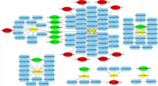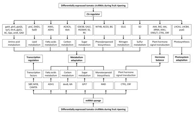 為了進(jìn)一步揭示circRNA在果實(shí)成熟中的作用,我們對circRNA靶向的miRNA以及miRNA的靶標(biāo)mRNA進(jìn)行了預(yù)測。結(jié)果發(fā)現(xiàn)其中20個circRNA上含有7個miRNA結(jié)合位點(diǎn),同時鑒定出94個miRNA的靶標(biāo)mRNA。通過對鑒定到的94個靶標(biāo)mRNA進(jìn)行GO富集和KEGG分析,總結(jié)出circRNA可能通過調(diào)節(jié)代謝過程、激素平衡以及光合相關(guān)的通路來調(diào)控番茄果實(shí)成熟。此外,circRNA還可能通過參與轉(zhuǎn)錄調(diào)控,主要是通過調(diào)節(jié)包括ERF、SBP、MYB等果實(shí)成熟相關(guān)的轉(zhuǎn)錄因子,來調(diào)節(jié)番茄果實(shí)的成熟。