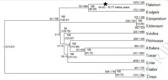 苦蕎與擬南芥、可可、大豆、葡萄、楊樹、馬鈴薯、番茄以及單子葉的水稻和玉米構(gòu)建系統(tǒng)發(fā)育進(jìn)化樹,見下圖。此外還進(jìn)行基因家族聚類分析,找出共同和特有的基因家族。