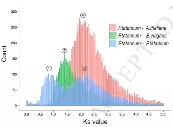 通過苦蕎與擬南芥、苦蕎與甜菜進(jìn)行分析,通過Ks計(jì)算發(fā)現(xiàn)苦蕎經(jīng)歷了全基因組復(fù)制事件,近期是在下圖0.84-0.92之間,而更古老的一次復(fù)制發(fā)現(xiàn)在64.42~70.77 Mya。而全基因組復(fù)制事件的發(fā)生,也導(dǎo)致了很多與抗逆相關(guān)基因家族的擴(kuò)張或者保留。這也與后期苦蕎的抗逆性有一定關(guān)系。