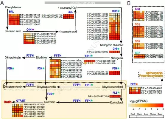 蘆丁的生物合成具有特殊的意義,而苦蕎被認(rèn)為是這種有益的類黃酮的主要食物來源??喔墒w麥營(yíng)養(yǎng)生物質(zhì)中含有3%的蘆丁。通過比較基因組以及不同生長(zhǎng)部位的轉(zhuǎn)錄組測(cè)序,發(fā)現(xiàn)原來所不知道的全長(zhǎng)蛋白CHI(FtPinG0002790600)和f3h(FtPinG0006662600)。