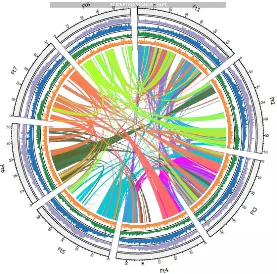 苦蕎通過K-mer預(yù)估基因組大小約為489Mb,流式細(xì)胞儀預(yù)估為540Mb。共組裝出來489.3Mb的基因組序列,共8778個(gè)Contigs,Contig N50=550.7kb。通過Hi-C數(shù)據(jù)將436.4Mb的序列錨定到8條染色體上(定位比例為89.18%)。然后再通過光學(xué)圖譜數(shù)據(jù)進(jìn)行校正。三代數(shù)據(jù)的準(zhǔn)確性通過二代評(píng)估為99.96%,并且在基因區(qū)具有更少的錯(cuò)誤存在。