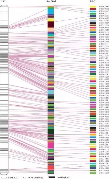 白對蝦是一個高雜合物種,其基因組含有80%的重復(fù)序列,其基因組組裝是一個很大的難題。本研究通過對遺傳圖譜、白對蝦初步組裝的Scaffold、BAC測序的序列進行共線性比較,最終使得5922個標記錨定到5885個Scaffold上,有利于后續(xù)白對蝦的基因組組裝。