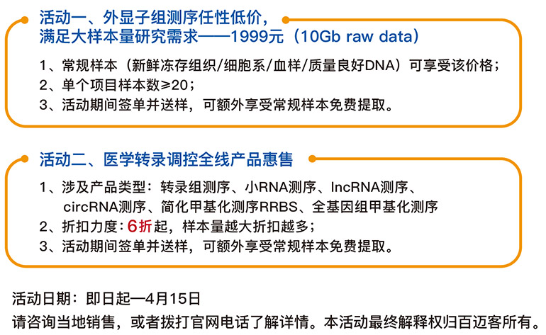 開(kāi)學(xué)季,放禮季,百邁客醫(yī)學(xué)產(chǎn)品全線促銷活動(dòng)開(kāi)啟。百邁客全外顯子組測(cè)序(10Gb/樣本,Q30>85%),主流外顯子捕獲平臺(tái)羅氏NimbleGen SeqCap EZ Exome Library V3和安捷倫 SureSelect Human All Exon V6,一律1999元/樣本?。ǖ饶銇?lái)償鮮)