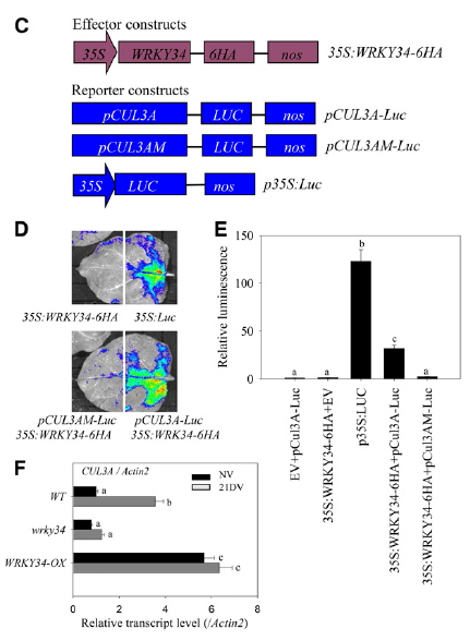 比如上面談到的Plant Cell的文章,作者發(fā)現(xiàn)轉錄因子WRKY34的轉錄迅速被冷應激誘導,之后構建pCUL3A-LUC載體和W-box區(qū)域突變pCUL3A-LUC載體,與WRKY34共注射入煙草和擬南芥葉原生質(zhì)體,來驗證WRKY34以預測的W-box與CUL3A啟動子結合以增加其CUL3A轉錄,而CUL3A又介導FRI降解調(diào)節(jié)擬南芥春化過程中的開花,從而把生物學故事由冷誘導—WRKY34轉錄—CUL3A轉錄—FRI降解—擬南芥春化過程中的開花這樣一條線串起來。