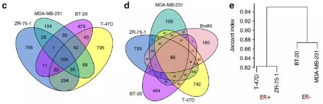 作者發(fā)現(xiàn)ER+乳腺癌細(xì)胞系中互作peak數(shù)目顯著高于ER-乳腺癌細(xì)胞系,且ER+乳腺癌細(xì)胞系中存在很大一部分距離大于2Mb的互作片段。分析樣本間互作peak的Jaccard相似性,發(fā)現(xiàn)ER+和ER-各自組內(nèi)具有更高的相似性。