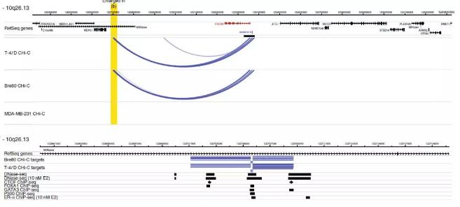 互作peak示例:下圖為10q26.13基因座的互作peak(loop),在ER+乳腺癌細(xì)胞系和正常乳腺上皮細(xì)胞系中鑒定到了互作peak,但是ER-乳腺癌細(xì)胞系中則未檢測(cè)到。互作靶基因的轉(zhuǎn)錄起始位點(diǎn)(TSS)位于捕獲區(qū)域內(nèi),并且和相距幾百Kb遠(yuǎn)的特異的HindIII酶切片段形成環(huán)(互作Peak)。在T-47D細(xì)胞系中,這些遠(yuǎn)距離片段與DNase I超敏位點(diǎn)、CTCF、FOXA1、GATA3轉(zhuǎn)錄因子結(jié)合位點(diǎn)以及雌激素受體ERα結(jié)合位點(diǎn)共定位。