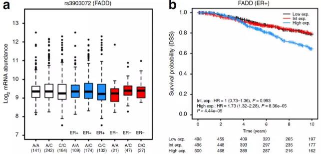 作者所納入的風(fēng)險(xiǎn)SNP在此之前只有一個(gè)位點(diǎn)(16q12.1-rs3803662)報(bào)道了與疾病預(yù)后相關(guān)。本研究中作者直接分析了代謝型乳腺癌隊(duì)列中潛在的靶基因的表達(dá)水平與的患者預(yù)后之間的關(guān)聯(lián)(分別對(duì)ER +和ER-亞組進(jìn)行生存分析)。其中32個(gè)靶基因(33%)與ER +乳腺癌患者的DSS相關(guān),6個(gè)DSS相關(guān)的靶基因?yàn)閑QTL靶基因。