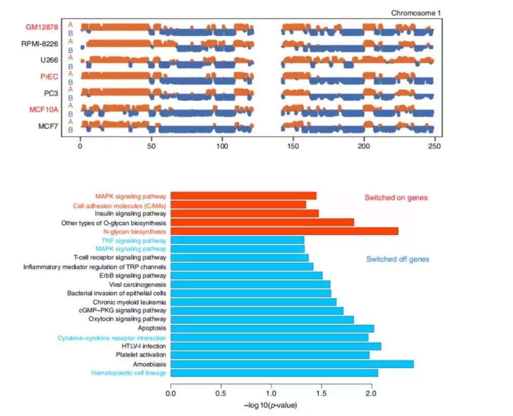 例如在人的多發(fā)性骨髓瘤文章中,作者利用正常B細胞(GM12878)和兩種亞型的骨髓瘤細胞(近二倍體U266和近三倍體RPMI-8226)進行Hi-C、WGS和RNA-seq測序,結(jié)果發(fā)現(xiàn),相比于GM12878,U266和RPMI-8226癌癥細胞中6%的區(qū)域均存在B轉(zhuǎn)換到A,1%的區(qū)域均存在A轉(zhuǎn)換到B,結(jié)合RNA-seq數(shù)據(jù),發(fā)現(xiàn)B轉(zhuǎn)換到A區(qū)域內(nèi)的基因變成轉(zhuǎn)錄活躍狀態(tài),而A轉(zhuǎn)換到B區(qū)域內(nèi)的基因變成轉(zhuǎn)錄抑制狀態(tài),KEGG富集通路發(fā)現(xiàn)這些基因與多發(fā)性骨髓瘤相關(guān),主要涉及MAPK信號轉(zhuǎn)導(dǎo)途徑、TNF信號轉(zhuǎn)導(dǎo)途徑、細胞因子和細胞因子受體相互作用途徑等,進一步在染色體2q11.2-q12.142處發(fā)現(xiàn)一個細胞因子基因簇,幾種白細胞介素IL1R1,IL1R2,IL18R1和細胞因子MAP4K4下調(diào)表達,這些基因在后續(xù)研究中重點關(guān)注。