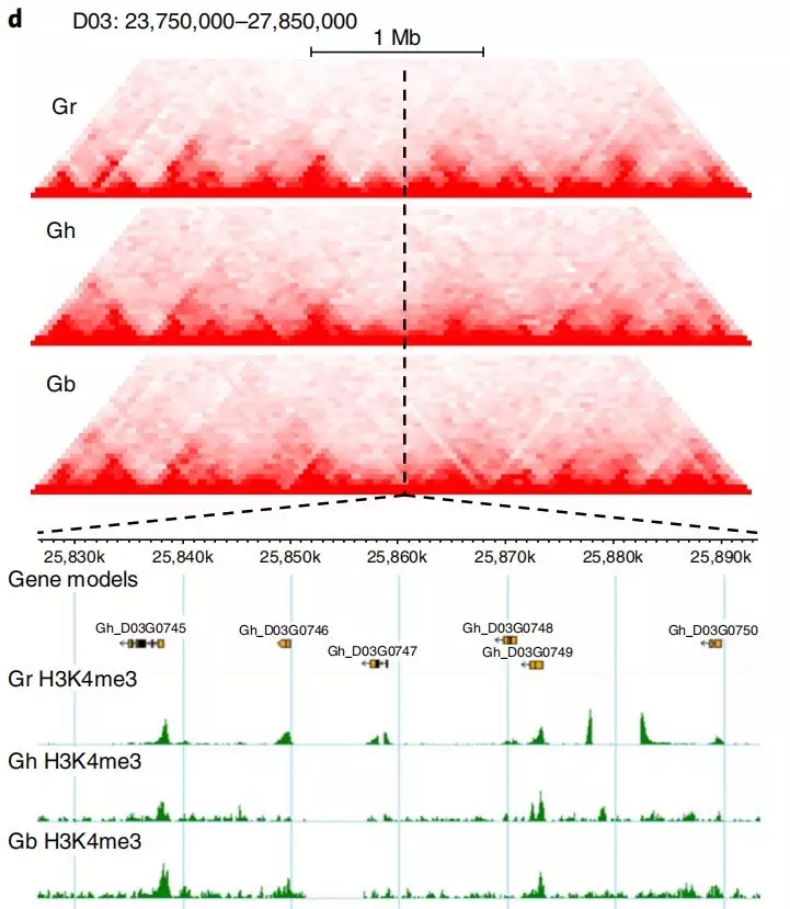 例如,在棉花的三維基因組進化文章中,作者對二倍體雷蒙德氏棉、二倍體亞洲棉、四倍體陸地棉和四倍體海島棉構(gòu)建了三維基因組圖譜,與雷蒙德氏棉D(zhuǎn)03染色體相比,陸地棉和海島棉對應(yīng)的D亞基因組中發(fā)生了染色質(zhì)重排,虛線對應(yīng)的TAD結(jié)構(gòu)發(fā)生了變化,雷蒙德氏棉中該TAD結(jié)構(gòu)完整,存在明顯的邊界,陸地棉中該邊界發(fā)生了左移,而海島棉中該TAD趨向于消失。因而通過鑒定TAD發(fā)生變化區(qū)域的基因,可以研究多倍化過程中基因表達調(diào)控的改變(研究多倍體的老師們,這可是一個很好的套路文章哦)。同時結(jié)合ChIP-seq數(shù)據(jù)對該TAD邊界進行分析發(fā)現(xiàn),雷蒙德氏棉富含豐富的H3K4me3(活性染色質(zhì)標記),而陸地棉和海島棉中H3K4me3顯著減少,說明在棉花的多倍化與表觀遺傳修飾存在密切關(guān)聯(lián)。