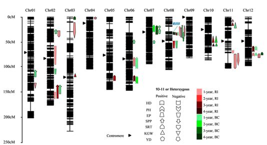 研究人員對多個雜交水稻組合的產(chǎn)量優(yōu)勢性狀進行多年、多地點的綜合分析發(fā)現(xiàn):每穗小花數(shù)和有效穗數(shù)是造成兩系雜交稻產(chǎn)量優(yōu)勢的主要原因,而且前者有超親優(yōu)勢,后者只有超父本優(yōu)勢。之后對源自LYP9后代的每個重組自交系(RIL)群體進行重測序的基礎(chǔ)上,構(gòu)建了一張高分辨率的遺傳連鎖圖,并利用RIL群體及其與母本回交的RILBC1群體進行產(chǎn)量相關(guān)性狀的遺傳定位,鑒定了一系列產(chǎn)量及其他優(yōu)勢相關(guān)性狀的QTL位點。同時,結(jié)合對幼穗發(fā)育早期的轉(zhuǎn)錄組分析以及QTL定位的結(jié)果,確定了多個與雜種優(yōu)勢相關(guān)候選基因。此外,還對一個產(chǎn)量雜種優(yōu)勢的主效位點進行了圖位克隆,發(fā)現(xiàn)rice heterosis 8 (RH8) 位點實際上是由DTH8/Ghd8/LHD1編碼的光周期調(diào)控的節(jié)律基因,它同時控制開花期、株高、分蘗數(shù),每穗小花數(shù)等多種性狀。隨后對361份雜交稻(其中包括125份二系雜交稻)的基因型解析后發(fā)現(xiàn),RH8的雜合性是兩系法雜交稻基因型的主要類型。