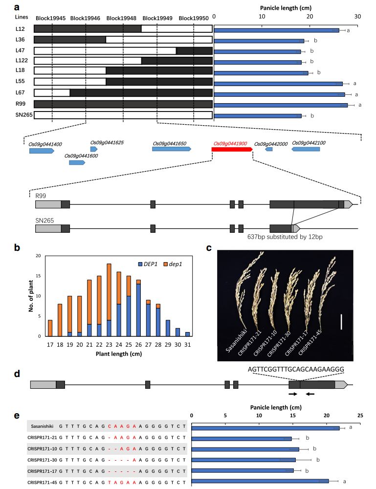 為了確定QTL簇的候選基因,進(jìn)一步做了基因的精細(xì)定位。首先,關(guān)注的是chr9上的 qPL9簇,候選基因被定位在43kb的區(qū)間內(nèi),其中包含7個(gè)注釋基因,通過(guò)序列比對(duì)分析發(fā)現(xiàn)一個(gè)候選基因DEP1上的exon5中存在堿基序列的替換,即R99中637bp的片斷在SN265中被替換成12bp的序列;接著共分離分析發(fā)現(xiàn)SN265型的dep1具有明顯短于R99的穗長(zhǎng)(圖5)。為了證明DEP1qPL9的候選基因,利用 CRISPR/Cas9技術(shù)對(duì)Sasanishiki品種中的DEP1基因誘變,獲得五個(gè)突變體株系,其中四個(gè)突變體發(fā)生移碼突變,呈現(xiàn)短穗長(zhǎng),另外一個(gè)突變體產(chǎn)生兩個(gè)氨基酸的替換,其穗長(zhǎng)與Sasanishiki無(wú)顯著性差異(圖5),暗示DEP1qPL9簇中控制穗長(zhǎng)的基因。