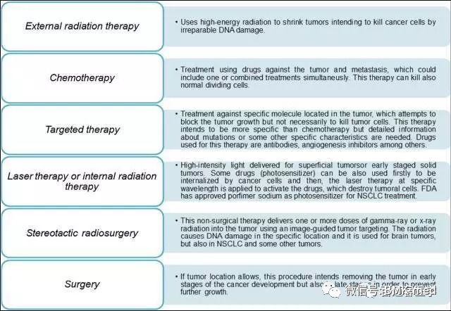 高強度射線照射表淺腫瘤或早期實體性腫瘤??墒紫葢媚承┧幬铮ㄈ绻饷魟?,使其進入腫瘤細胞后再應用特定波長的微波進行激光治療、?激活這些藥物從而破壞腫瘤細胞。FDA已批準卟吩姆鈉(porfimer?sodium)用作NSCLC治療的光敏劑;