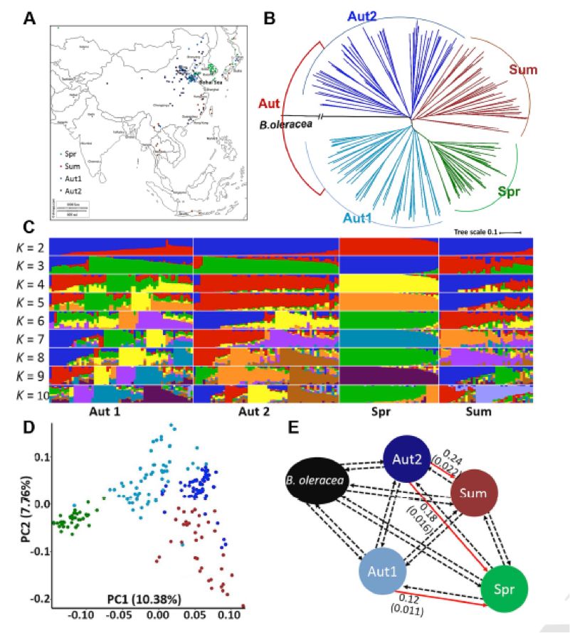 為了闡述中國大白菜的進(jìn)化和馴化歷史,本研究重點(diǎn)集中在下面幾個題:(1)哪一種大白菜是祖先種,(2)春大白菜在哪起源,(3)在春大白菜馴化時遺傳基礎(chǔ)是是什么。本研究提供來自3個生態(tài)型194個白菜的表型和基因型數(shù)據(jù),春大白菜的地理起源和馴化動力本鑒定。在全基因組的測序和分析后,本研究也證明了BrVIN3.1BrFLC1的優(yōu)良等位基因在馴化時變異的主要遺傳來源。