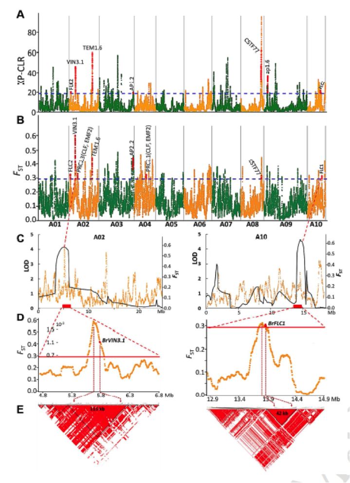 構(gòu)建了一個遺傳圖譜進(jìn)行QTL定位以找到抽薹時間相關(guān)的區(qū)域,一共找到了7個QTLs,其中QTLs ftA02.1 and ftA10.1被發(fā)現(xiàn)在受選擇的兩個候選區(qū)域內(nèi)。通過多年對表型變化影響的反復(fù)檢測,推測它們參與了抽薹時間的調(diào)控。