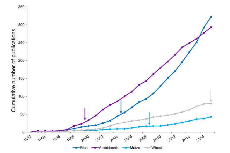 ATCG不規(guī)則的排列組合組成了地球上近870萬個(gè)物種形形色色的遺傳物質(zhì),而解密其內(nèi)在調(diào)控機(jī)制是生物工作者心心念念?yuàn)^斗的目標(biāo)。1977年,噬菌體ΦX174長達(dá)5375-bp基因組被測序完成,基因組測序事業(yè)開始蓬勃發(fā)展,時(shí)至今日,NCBI收錄了超過6000個(gè)真核生物和150,000個(gè)原核生物的測序數(shù)據(jù),其中包括禾本科。而基因組研究目的也從單純的科學(xué)研究向?qū)嵺`應(yīng)用發(fā)生著轉(zhuǎn)換。基因組學(xué)和生物技術(shù)相結(jié)合,包括標(biāo)記輔助選擇,基因組選擇和基因編輯,已成為育種中不可缺少的工具,功能基因的定位和克隆將會(huì)把這種技術(shù)的結(jié)合作用發(fā)揮更大。