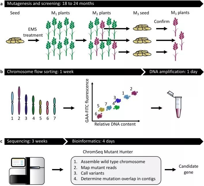 TILLING,即Targeting Induced Local Lesions IN Genomes(定向誘導(dǎo)基因組局部突變技術(shù)),是由Steven Henikoff領(lǐng)導(dǎo)的研究小組發(fā)展起來的,TILLING技術(shù)借助高通量的檢測手段,快速有效地從由化學(xué)誘變劑(EMS)誘變過的突變?nèi)后w中鑒定出點突變。目前此技術(shù)廣泛應(yīng)用于作物研究中,另外還有基因全基因組重測序的MutMap和MutMap +方法,實現(xiàn)功能基因的快速定位。MutRenSeq和MutChromSeq也應(yīng)用于突變基因定位,2016年John Innes Centre組織利用EMS誘變產(chǎn)生的小麥突變體,使用液相捕獲技術(shù),通過特異性的RNA捕獲探針對目標(biāo)區(qū)域進(jìn)行富集,二代測序后,通過比對野生型和抗性突變體的序列,找到了目標(biāo)抗性基因。MutChromSeq在此基礎(chǔ)上進(jìn)行改進(jìn),利用流式細(xì)胞儀技術(shù)將含目標(biāo)基因的單條染色體分離出來,后期結(jié)合高通量測序,通過比較突變體及野生型的差異,快速克隆基因,此方法大大降低重測序的難度,減少了其它染色體序列對目標(biāo)序列的影響。
