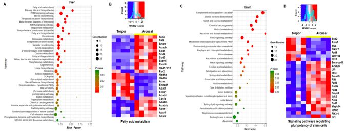 與其它高原哺乳動物不同,喜馬拉雅旱獺在冬季冬眠。為了闡述旱獺冬眠的分子機制,研究人員分析了來自喜馬拉雅旱獺肝臟和大腦的RNA-seq數(shù)據(jù),以表征在冬眠/覺醒周期中基因表達(dá)的變化。差異表達(dá)的基因(DEGs)顯著富集在肝臟中脂肪酸代謝,萜類骨架生物合成和初級膽汁酸生物合成的途徑(圖3 A)。并清楚地觀察到在冬眠狀態(tài)下,參與脂肪酸降解的基因的上調(diào)及參與脂肪酸合成的基因的下調(diào),暗示了一個√確的脂質(zhì)代謝調(diào)節(jié)機制(圖3 B)。此外,還發(fā)現(xiàn)在覺醒狀態(tài)下,包含與藥物代謝相關(guān)的基因-細(xì)胞色素P450,氨基酸的生物合成和碳水化合物分解代謝相關(guān)基因的總體下調(diào)。
