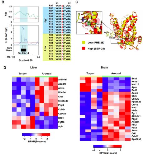 為了更好地了解喜馬拉雅旱獺的高原適應(yīng)性機制,研究人員從極高海拔(海拔> 4,500 m,n = 10)和相對低海拔(<1,900 m,n = 10)收集了20只喜馬拉雅旱獺。研究人員首先測量了血液參數(shù),發(fā)現(xiàn)與低海拔喜馬拉雅旱獺相比,高海拔喜馬拉雅旱獺的一些血液相關(guān)性狀,尤其是紅細(xì)胞計數(shù),血紅蛋白濃度和平均紅細(xì)胞體積顯著增加。接下來,對每個喜馬拉雅旱獺進(jìn)行了全基因組測序,并在喜馬拉雅旱獺基因組中搜索了具有高種群分化(Fst)和多樣性比率(qp,low/qp, high)的區(qū)域,最終鑒定了分布在喜馬拉雅土撥鼠基因組不同scaffolds?中的24.84 Mb受選擇的區(qū)域。這些區(qū)域含有383個功能基因,與非選擇性基因相比,這些基因具有更高的Ka / Ks值(P <0.01),主要功能類別包括“缺氧反應(yīng)”,“DNA修復(fù)”,“血管生成”,“心臟功能”,“脂肪酸代謝”,“細(xì)胞周期”,“發(fā)熱”和“鈣信號通路”。參與缺氧誘導(dǎo)因子-1(HIF-1),血管內(nèi)皮生長因子(VEGF)或其它缺氧相關(guān)信號通路的10個功能基因,包括Slc25a14,Nox-1,Hmox1,Vegfr2,Atg16l2,Bex1,Ptgr2,Gprasp1,F(xiàn)am46d?和Chd3,在高海拔和低海拔群體之間顯示出明顯的基因分型差異(圖4 A)。在Slc25a14中發(fā)現(xiàn)了非同義替換(由Ser28取代Phe28,F(xiàn)28S),其顯示出*強的分化信號(FST = 0.73)(圖4 A和B)?;谕唇5腟lc25a14的三維結(jié)構(gòu)顯示,F(xiàn)28S替換發(fā)生在N末端的loop區(qū)域,并且由于氨基的電荷和極性的變化而增加其與相鄰的α-螺旋的距離(圖4 C)。為了進(jìn)一步評估這一變體的功能影響,研究人員將突變體Slc25a14與其在不同哺乳動物中的直系同源基因進(jìn)行比對,并發(fā)現(xiàn)Phe28在比對的其它動物中高度保守。該突變體功能影響的預(yù)測證明F28S取代是有害的,所有這些結(jié)果都表明F28S突變可能是高海拔群體Slc25a14選擇性清除的結(jié)果。為了推測旱獺高海拔適應(yīng)和冬眠的遺傳適應(yīng)性機制,研究人員在選擇性清除區(qū)域鑒定到了116個差異表達(dá)基因,在這些基因中,25個差異表達(dá)基因與HIF-1途徑相關(guān),主要屬于DNA修復(fù),血管生成,脂肪酸代謝,細(xì)胞凋亡/細(xì)胞周期和發(fā)熱的類別相關(guān)。在冬眠/覺醒周期中,大量選擇性清除基因具有差異表達(dá),表明這兩種生物學(xué)過程之間存在共同的遺傳影響(圖4 D)。在這些基因中,Bex1, Apln, kcne1l, Med12, Dad1和Fgf16在冬眠階段肝臟或腦中顯著上調(diào)(圖4 D),進(jìn)一步證明這些基因參與冬眠和高原適應(yīng)性,先前的研究報道了這些基因參與許多生理過程,包括神經(jīng)元分化,肝再生,血管生成和能量代謝,而這需要進(jìn)一步的實驗驗證。