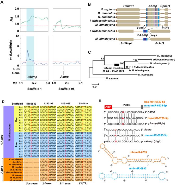 假基因逐漸被認(rèn)定為是適應(yīng)性表型多樣化的重要調(diào)節(jié)因子,與選擇性清除信號相關(guān),研究人員鑒定了27個參與極高海拔適應(yīng)的候選假基因,占全基因組范圍內(nèi)假基因的1.83%。這一比率幾乎與具有1.78%的功能基因的比率相當(dāng),表明它們在極端環(huán)境的適應(yīng)性中的作用不可忽略。與蛋白質(zhì)編碼基因中發(fā)現(xiàn)的群體基因型差異一致,研究人員在高海拔群體中觀察到受選擇的假基因中幾乎固定的突變,例如ΨAamp,ΨAdl1和ΨRnf114。在這些假基因中,血管相關(guān)的遷移細(xì)胞蛋白假基因(ΨAamp)具有完整的基因結(jié)構(gòu)并顯示出*高的Fst值(Fst = 0.67),但ΨAamp未被檢測為受選擇性基因(圖4 A和5 A)。ΨAamp的結(jié)構(gòu)顯示它是一個整合的加工假基因,其mRNA通過逆轉(zhuǎn)錄被插入基因組中(圖5 B)。這個假基因含有過早終止密碼子(第208個核苷酸,C> T),缺失/插入和移碼突變,使其不能翻譯成功能性的蛋白,Aamp和ΨAamp的共線性分析表明在不同哺乳動物中Aamp是高度保守的。然而,在地松鼠和喜馬拉雅旱獺中發(fā)現(xiàn)并保存了高度保守的共線性位點(圖5 B),進(jìn)一步的系統(tǒng)發(fā)育分析表明,ΨAamp和Aamp屬于兩個獨立的分支,基于序列分歧插入時間的估算暗示假基因的插入事件發(fā)生在約22.64~25.40 MYA,在喜馬拉雅旱獺和地松鼠分化之前(圖?5 C)。這些發(fā)現(xiàn)支持古老的假基因?qū)τ谒墒缶哂刑禺愋圆墓餐淖嫦冗z傳而來這一假設(shè),然而,與地松鼠相比,喜馬拉雅旱獺顯示Aamp和ΨAamp之間的序列距離較小,這表明存在選擇性壓力來維持旱獺的遺傳元素。