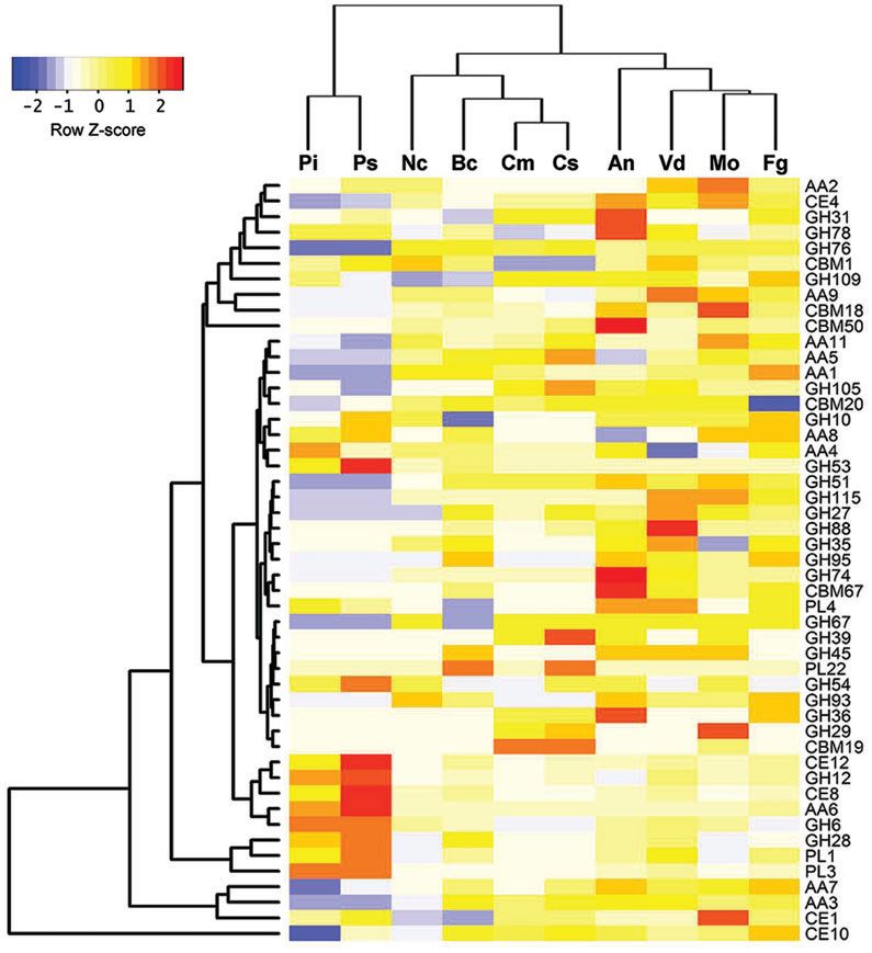 成熟的植物致病真菌可以分解并利用CAZymes的植物細(xì)胞壁多糖。尾孢菌(Cercospora sojina)含有596個預(yù)測的CAZymes。與其他真菌相比,C.sojina具有更大的潛在碳水化合物酯酶組,其可催化取代糖的N-去酰化。在C. sojina基因組中,有大約23.5%的潛在分泌蛋白被預(yù)測為CAZyme,證明C.sojina可能在入侵期間使用大量CAZymes來消化宿主細(xì)胞壁。有趣的是,其中一個CAZymes家族,即糖苷水解酶GH109家族,是高度富集的(圖6)。