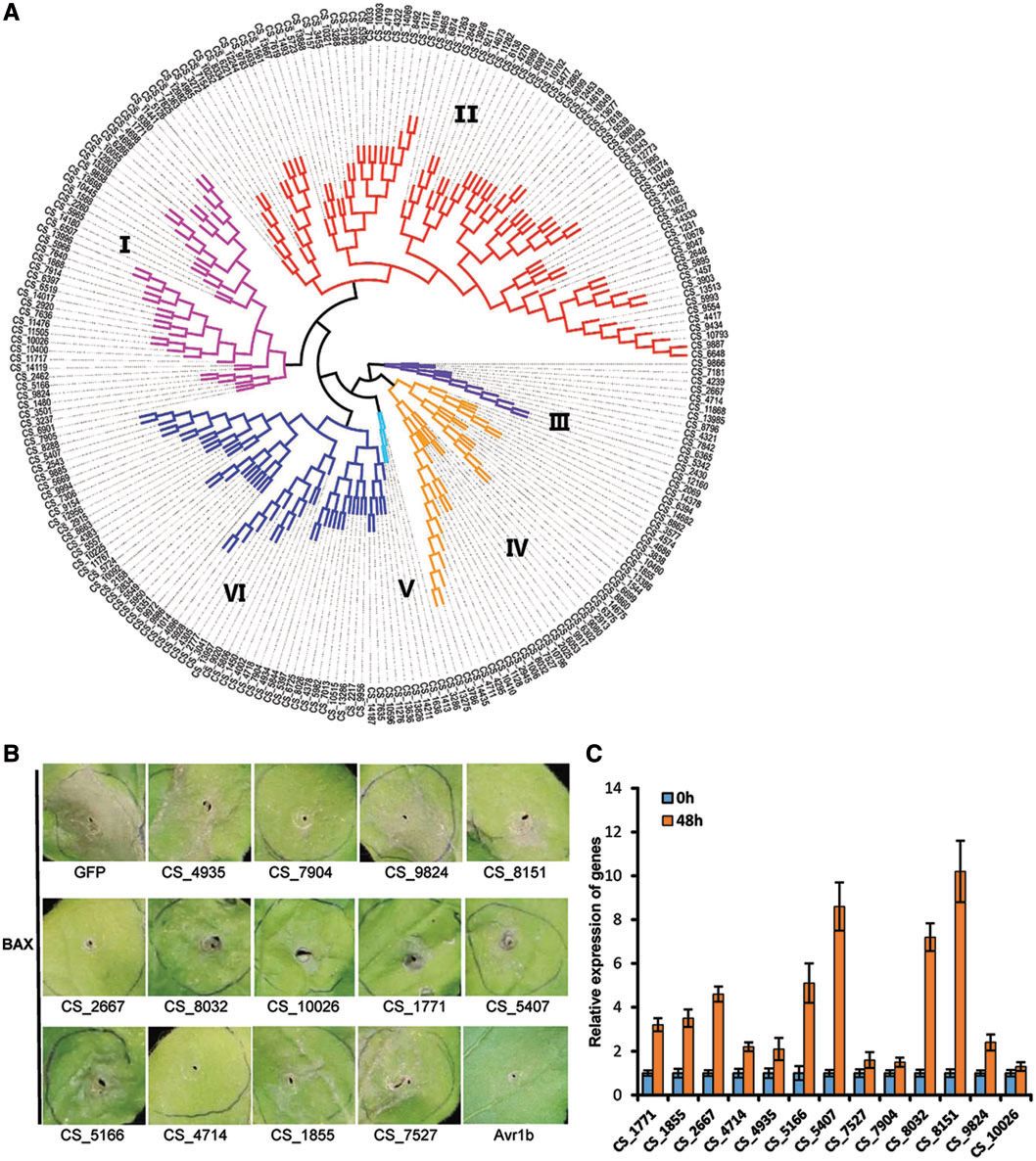 因此,我們嘗試研究效應(yīng)器功能。促凋亡小鼠蛋白BAX誘導(dǎo)的本氏煙草程序性細(xì)胞死亡(PCD)在生理上可能與病原體引起的防御相關(guān)的過敏反應(yīng)相似,提供了有價值的篩查可以抑制與防御相關(guān)的PCD的效應(yīng)物的方法。我們隨機選擇50個效應(yīng)子并在本塞姆氏煙草中瞬時表達(dá)它們以篩選可以抑制BAX觸發(fā)的PCD(BT-PCD)的潛在效應(yīng)物。結(jié)果表明,約1/4選擇的效應(yīng)子強烈抑制BT-PCD(圖7B)。此外,qRT-PCR結(jié)果顯示,大多數(shù)這些推定的效應(yīng)子在C.sojina感染后48小時被轉(zhuǎn)錄誘導(dǎo)(圖7C),這意味著它們可能有助于大豆灰斑病的早期感染。