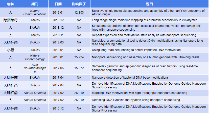 目前市場常用重亞硫酸鹽法檢測5mC,其√確度高,但化學處理會導致DNA分子的片段化、測序深度高、無法鑒定更多修飾類型。Nanopore技術作為新一代基于納米孔的單分子實時電信號測序技術,截至目前,全球范圍內基于Nanopore平臺進行的甲基化研究文章近10篇,見刊于nature methods、bioRxiv等國際知名期刊。