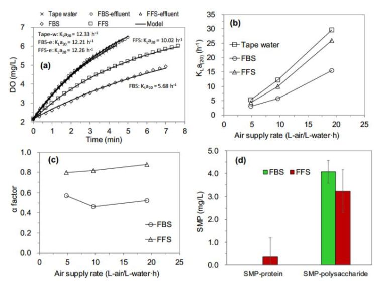 圖2.?(a)FBS及其排出水, FFS及其排出水,?自來水氧轉(zhuǎn)運試驗中的溶解氧濃度(mg/L);不同曝氣條件下,F(xiàn)BS和FFS的(b)KLa值;(c)α-因子值;(d)FBS和FFS的溶解性微生物產(chǎn)物(SMPs):蛋白和多糖濃度(mg/L)