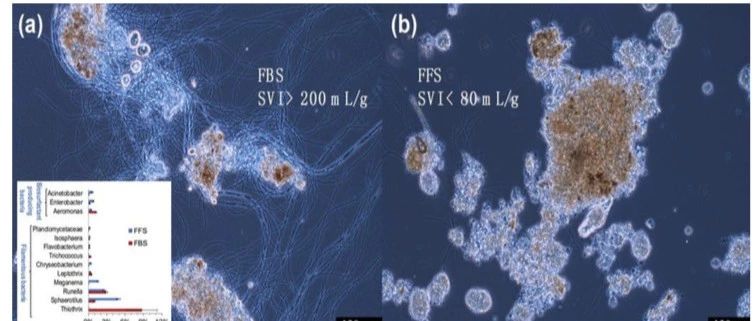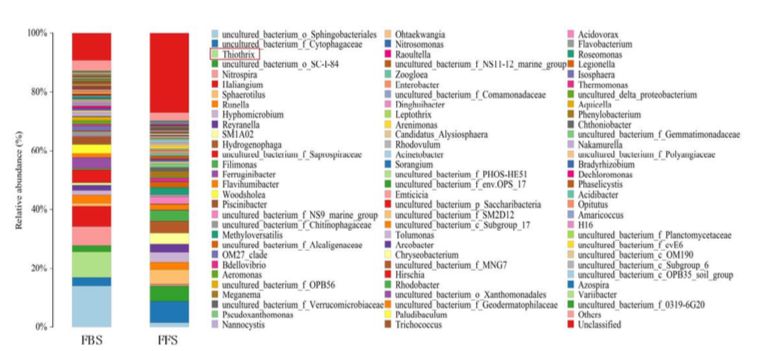 FBS和FFS的菌群結(jié)構(gòu)如圖7所示。FBS和FFS含有大量的共有菌,其中絲硫菌屬(thiothrix)、球衣菌屬(Sphaerotilus)、古字狀菌屬(Runella)、meganema(甲基桿菌科分類下的屬)、纖毛菌屬(Leptothrix)、金黃桿菌屬(chryseobacterium)、毛球菌屬(Trichococcus)、黃桿菌屬(Trichococcus)、isosphaera(浮霉菌科分類下的屬)和浮霉菌科(planctomycetaceae)是FBS和FFS豐度排名前十的菌;?FBS和FFS的優(yōu)勢菌存在差異,未分離培養(yǎng)(uncultured)的噬纖維菌(cytophagaceae)和鞘脂桿菌(sphingobacteriales)分別在FBS和FFS中豐度最高;FFS和FBS的所有菌在各自反應器的排出水中均被檢測到。從圖8來看,絲硫菌屬(thiothrix)在FFB中的相對豐度超過8.5%,而在FFS中數(shù)量極少,絲硫菌屬(thiothrix)的長菌絲(0.5-1.5 μm)會連接污泥絮狀物,導致污泥降解能力降低,污水的表面粘度增加;盡管球衣菌屬(Sphaerotilus)和古字狀菌屬(Runella)在FFS和FBS中的豐度均較高,但它們的菌絲較短,對污泥沉降、表觀粘度和氧轉(zhuǎn)運的負面影響較小;其他絲狀細菌的豐度較低,影響程度較小。因此推測,絲硫菌屬(thiothrix)就是影響FBS氧轉(zhuǎn)運的最大“元兇”。從種水平來看,絲硫菌屬(thiothrix)分類下的eikelboomii是FBS的優(yōu)勢菌,至此,“真兇”也基本確定。