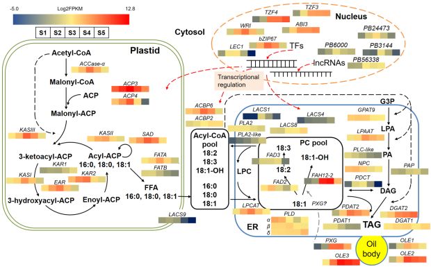 蓖麻油酸是一種高價值的羥基脂肪酸,具有十分廣泛的工業(yè)應(yīng)用前景。風(fēng)箏果種子中含有約80%的蓖麻油酸,是該不飽和脂肪酸的新來源。為了探究蓖麻油酸在體內(nèi)合成和調(diào)控的分子機(jī)制,本研究收取不同發(fā)育階段的風(fēng)箏果種子進(jìn)行脂肪含量分析并發(fā)現(xiàn),在種子發(fā)育的前中期(授粉后的16-22天),蓖麻油酸迅速富集。結(jié)合二代和三代全長轉(zhuǎn)錄組測序,共鑒定到12,555個差異轉(zhuǎn)錄本,其中GO注釋富集到與脂質(zhì)代謝相關(guān)的96條term共1,049個DEGs;454個DEGs 富集到16條脂質(zhì)代謝相關(guān)的KEGG通路中。綜合分析,共鑒定到包括參與脂質(zhì)代謝的71種酶,246個潛在的轉(zhuǎn)錄因子及124個長鏈非編碼RNA(lncRNAs);其中有12個基因參與多種脂質(zhì)代謝通絡(luò),如脂肪酸的生物合成和修飾(羥基化)、脂質(zhì)轉(zhuǎn)運(yùn)、三酰甘油合成、酰基編輯和脂滴形成等,且在種子發(fā)育過程中,呈現(xiàn)高表達(dá)水平,并與蓖麻油酸的累積模式一致。通過共表達(dá)網(wǎng)絡(luò)分析,還鑒定到57個轉(zhuǎn)錄因子和35個lncRNA與蓖麻油酸的合成有關(guān)。本研究結(jié)果為在轉(zhuǎn)錄水平上開發(fā)一種新的蓖麻油酸原料奠定了基礎(chǔ),為其他植物中蓖麻油酸的生產(chǎn)提供了有價值的候選基因。