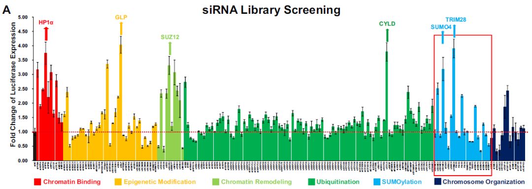 為了確定可能導致HIV-1抑制和潛伏的細胞靶點,作者定制了siRNA文庫在ZM-bl細胞系中進行高通量篩選,該文庫靶向細胞核內的幾種細胞途徑的182個基因,包括chromatin binding, epigenetic modification, chromatin remodeling, ubiquitination, SUMOylation 和 chromosome organization。分析敲除各靶標基因后熒光素酶的表達水平變化(以siNC為對照),許多蛋白質對應的熒光素酶表達升高,表明這些蛋白限制HIV-1啟動子的活性,最明顯包括HP1α、GLP、SUZ12和CYLD,其已被鑒定為抑制HIV-1轉錄。其中,兩個較少見的SUMO化途徑基因TRIM28和SUMO4敲低后,顯著上調了HIV-1啟動子活性。