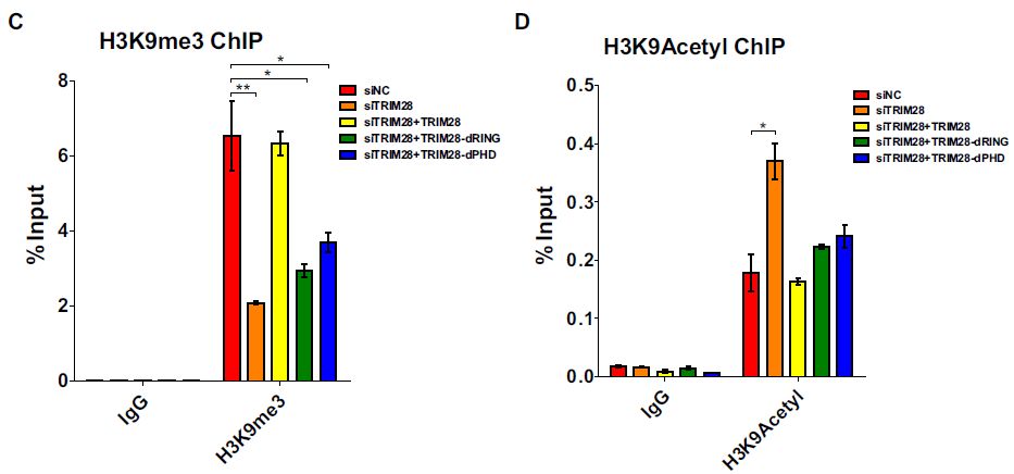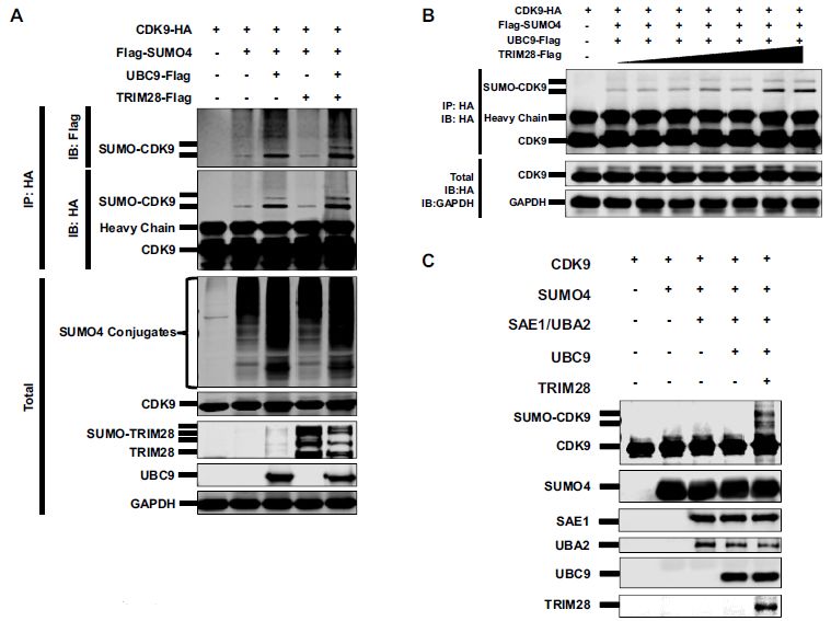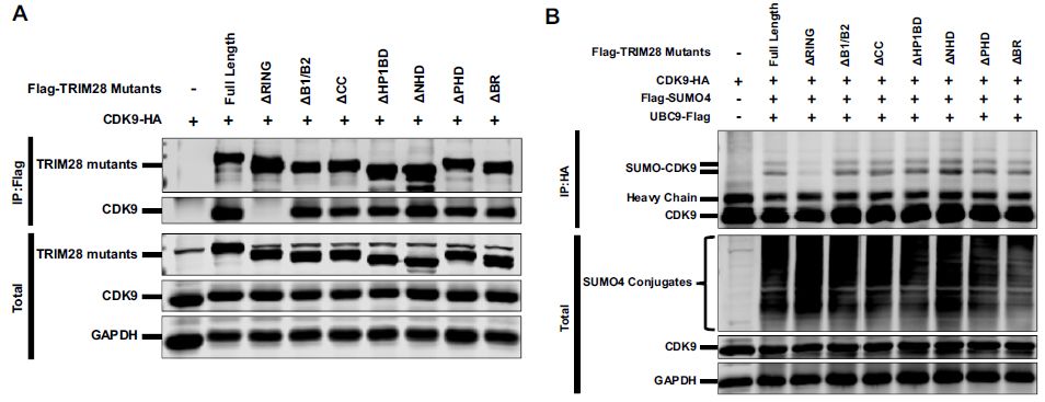 免疫共沉淀(Co-IP)實驗發(fā)現(xiàn)即使在RNase存在下CDK9也與TRIM28結合。為了鑒定TRIM28的哪個區(qū)域與CDK9結合,構建各種TRIM28缺失突變體以富集CDK9:RING結構域缺失中止了CDK9的結合以及CDK9的SUMO化。實驗表明外源表達的TRIM28也與CDK9共定位??傊?,研究表明RING和PHD都具有E3連接酶活性并富集UBC9。