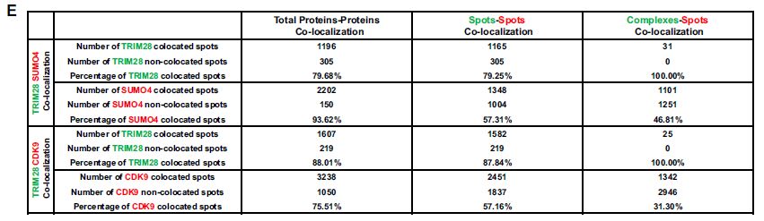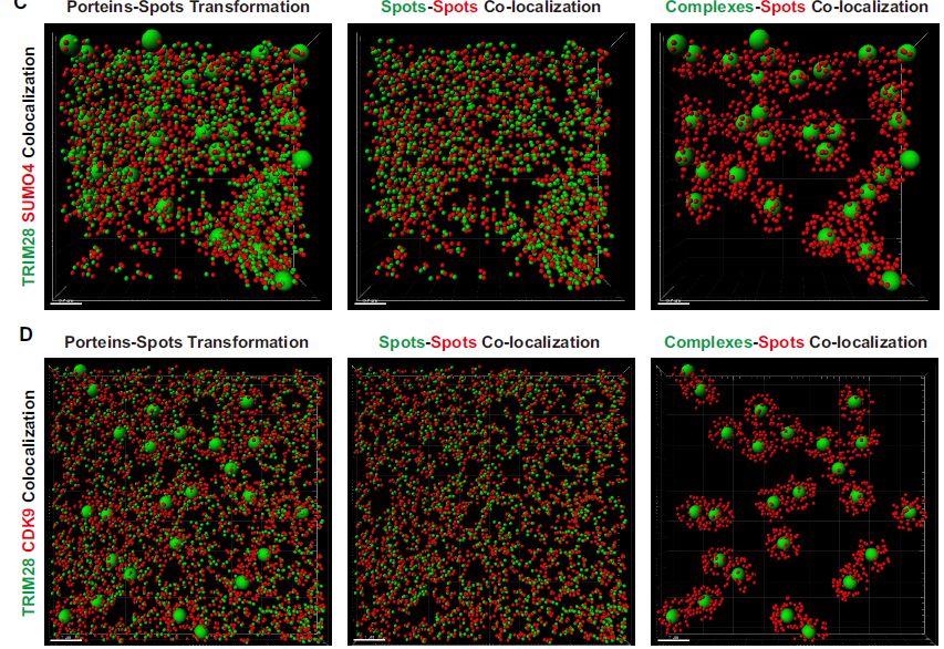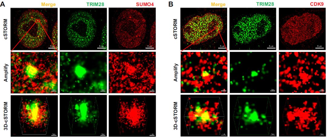 為了確定TRIM28是否與CDK9結合,作者使用超分辨率的連續(xù)隨機光學重建顯微鏡(cSTORM)來研究分辨率為20nm二者間的三維(3D)共定位。TRIM28存在于細胞核中,與點狀SUMO4共定位。放大視圖和3D-cSTORM,發(fā)現(xiàn)SUMO4蛋白被TRIM28富集并形成大斑點。CDK9存在于細胞核內的分散點中,但仍發(fā)現(xiàn)CDK9與TRIM28共定位。與SUMO4類似,CDK9蛋白被TRIM28富集并包圍TRIM28。近80%的TRIM28斑點或復合物與94%的SUMO4斑點共定位,88%的TRIM28斑點或復合物與76%的CDK9斑點共定位。