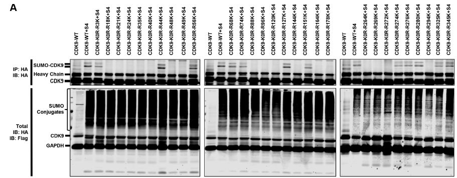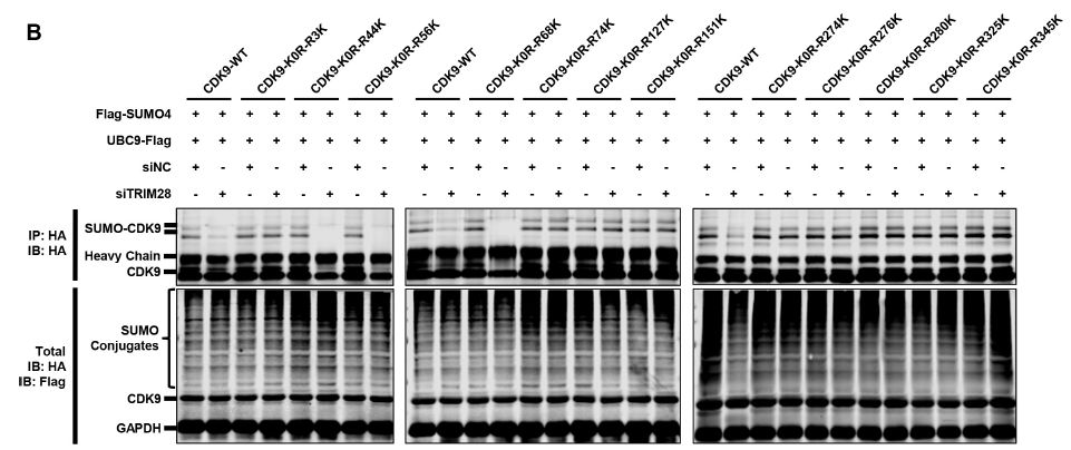 接下來作者試圖鑒定應該在CDK9?賴氨酸殘基上發(fā)生的SUMO化位點。賴氨酸突變實驗結果:CDK9-K0R突變體含有所有賴氨酸變?yōu)榫彼岬耐蛔?,完全中止了CDK9被SUMO化的能力;其他CDK9突變體仍然能夠通過TRIM28進行SUMO化,這表明在整個CDK9序列中可能存在多個SUMOylation位點。采用基于CDK9-K0R全突變體的逆轉突變策略,發(fā)現(xiàn)CDK9上的幾個賴氨酸顯著SUMO化。其中,多個SUMO化位點與CDK9 C-末端自身磷酸化位點相鄰,據(jù)報道這些位點是Tat-P-TEFb與TAR RNA高親和力結合所必需的,即?SUMO化可以通過阻止相鄰的磷酸化來降低結合能力。