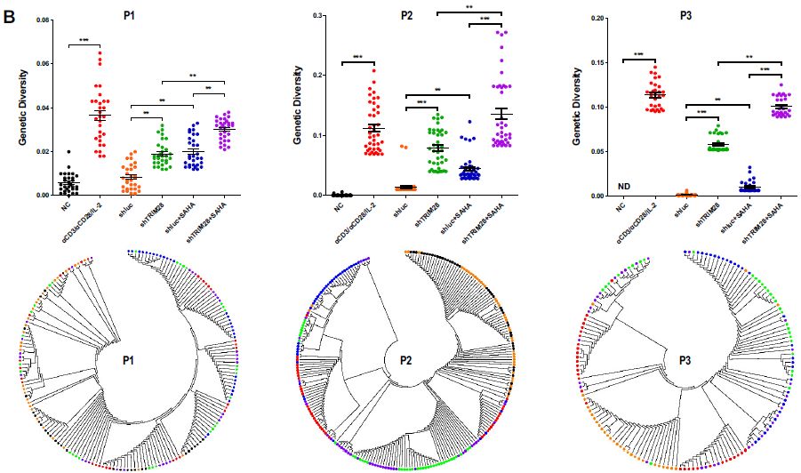 之后作者試圖確定TRIM28的敲低是否在接受抑制性cART療法至少6個月的HIV-1感染者的靜息CD4+T細胞中重新激活潛伏的HIV-1?;诩毎麅菻IV-1 RNA的定量,表明用αCD3/αCD28刺激顯著誘導HIV-1的表達。TRIM28敲低重新激活了與HDAC抑制劑SAHA相似量的HIV-1 RNA表達。在將TRIM28敲低與SAHA組合后,重新激活效果更顯著。同樣,SUMO4敲低和SAHA添加的組合使用可以重新激活比單獨使用更多的HIV-1 RNA表達。雖然TRIM28單獨缺失重新激活相似數(shù)量的具有SAHA的遺傳多樣化HIV-1表達,但TRIM28敲低和SAHA的組合重新激活了更多遺傳多樣化的HIV-1表達。