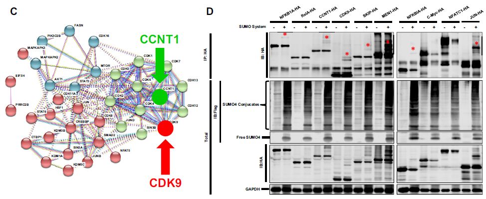 為了鑒定由TRIM28 SUMO化的候選底物,作者進行了全局位點特異性SUMO化質譜(SUMO-MS),鑒定了1,329個SUMO化蛋白,并構建了相互作用置信度為0.7的STRING互作網絡,MCODE分析發(fā)現(xiàn)STRING核心網絡可以聚類成12個亞群。GO分析發(fā)現(xiàn)細胞和代謝過程是SUMO化蛋白可能參與的前兩個生物過程。通過k-means聚類特異性地將轉移酶和轉錄因子聚類,并用STRING分析進行可視化,發(fā)現(xiàn)許多候選蛋白對于HIV-1表達是關鍵的,例如JUN、JUNB、JUND、mTOR、STAT3、Cyclin T1(CCNT1)和CDK9。將SUMO化蛋白鑒定的顯著性閾值調低到10^-8,CDK9仍然排名靠前。作者在體外驗證了全局位點特異性SUMO-MS的可靠性。