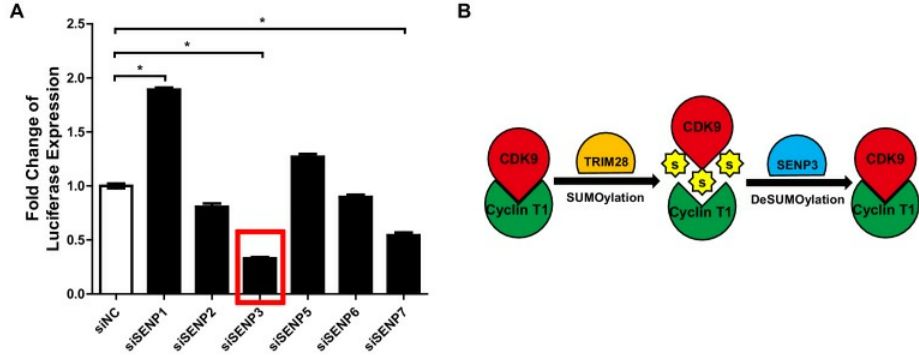 作者進一步研究SUMO4在TRIM28介導的CDK9 SUMO 經中的作用來鑒定其潛在的機制。通過CDK9與SUMO1、SUMO2和SUMO4共同過表達實驗,發(fā)現(xiàn)CDK9主要由SUMO1和SUMO4 SUMO化。補充過表達TRIM28后,SUMO-CDK9量變得更豐富。然而,如果僅用TRIM28共表達CDK9但沒有SUMO E2 酶UBC9時,SUMO化水平沒有增加,這表明TRIM28介導的SUMO化是UBC9依賴性的。當TRIM28表達逐漸增加時,SUMO-CDK9 化水平以劑量依賴性增加。體外SUMO化測定表明,僅當將SUMO4、E1 SAE1/UBA2,E2 UBC9和TRIM28一起提供到SUMO化反應緩沖液中時,SUMO4與CDK9結合。在HeLa細胞中敲除TRIM28后,SUMO化的CDK9減少。前面的siRNA文庫篩選實驗中表明,幾種SUMO特異性蛋白酶(SENP)抑制HIV-1表達,尤其是SENP3,用TRIM28共表達SENP3,發(fā)現(xiàn)SENP3阻止了TRIM28介導的CDK9 SUMO化。作者在原代CD4+?T細胞中證實了以上結論。總之,TRIM28介導SUMO4與CDK9的結合,其被SENP3逆轉。