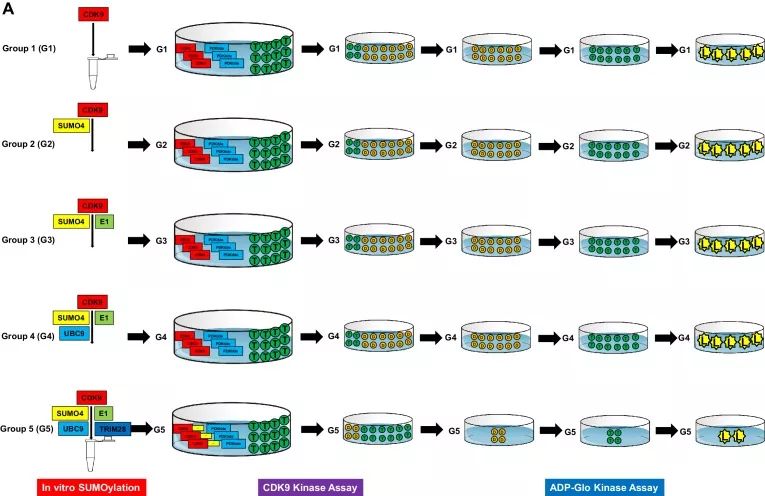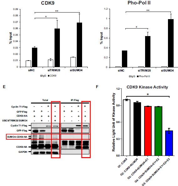 Co-IP實驗發(fā)現(xiàn)細胞周期蛋白Cyclin T1僅與野生型CDK9結合形成正性轉錄延伸因子P-TEFb復合物,而不是SUMO化的CDK9。為了研究TRIM28介導的CDK9 SUMO化是否影響CDK9的激酶活性,進行了體外CDK9 SUMO化測定和CDK9激酶活性測定:發(fā)現(xiàn)當TRIM28 SUMO化CDK9時,CDK9的激酶活性顯著降低。不添加TRIM28,CDK9的激酶活性不受影響,盡管已添加其他SUMO化組分。