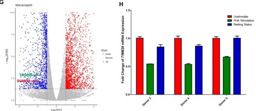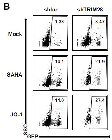 通過實驗發(fā)現(xiàn)si-TRIM28過表達抑制了HIV-1啟動子活性的基礎水平,并以劑量依賴的方式挽救了HIV-1抑制;當與HIV-1 Tat和TNFα組合過表達時,上調更顯著;TRIM28在多種細胞系和原代細胞中普遍表達。為搜索HIV-1潛伏相關基因,作者利用RNA-Seq比較未刺激和PHA刺激的原代CD4+?T細胞中的基因表達作為補充實驗,TRIM28在未刺激的原代CD4+?T細胞中高表達,并在PHA激活后下調。當活化的CD4+?T細胞恢復到靜止狀態(tài)時,TRIM28的表達再次上調。為了測試TRIM28是否有助于HIV-1潛伏,在HIV-1潛伏細胞系J-Lat 10.6以及其他HIV潛伏細胞系模型(J-Lat 6.3/8.4/9.2和15.4)中敲低了TRIM28,發(fā)現(xiàn)TRIM28的缺失上調了HIV-1的表達。此外,當補充廣泛定義的LRA:組蛋白去乙酰化酶(HDAC)抑制劑SAHA或BET結構域抑制劑JQ-1時,HIV-1重新激活增強得更高。