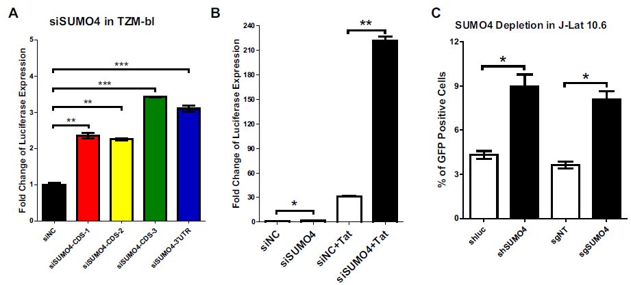 前面siRNA文庫篩選中,SUMO4缺失比其他SUMO旁系同源物缺失更顯著上調HIV-1啟動子活性。當與HIV-1 Tat過表達組合時,上調更顯著,其現(xiàn)象與TRIM28實驗中觀察到的相似。SUMO4的敲低或敲除也能夠在J-Lat 10.6中重新激活潛在的假HIV-1。原代CD4+?T細胞被PHA刺激后,SUMO4的表達下調,恢復到靜止期后達SUMO4表達恢復到基礎水平。