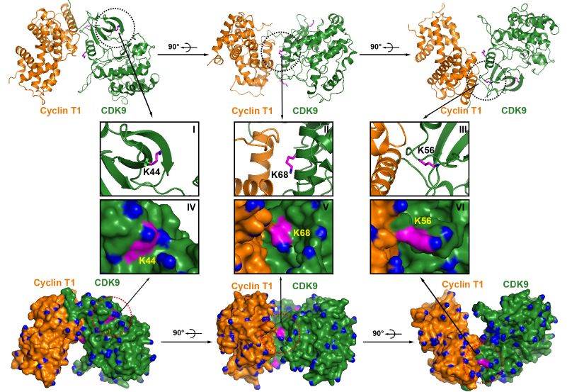 為了進一步確定哪些位點確實僅被TRIM28 SUMO化,作者敲除了內源性TRIM28并測試了上述鑒定候選位點的SUMO化潛力,發(fā)現(xiàn)Lys44、Lys56和Lys68的SUMO 化信號在缺乏內源性TRIM28時完全消失,進一步支持這些位點被TRIM28特異性SUMO化。直接分析富集的SUMO-CDK9的靶特異性SUMO-MS也證實了該結果。Lys44的乙?;瞧浼っ富钚运匦璧?,其他2個SUMO化位點Lys56和Lys68在CDK9和細胞周期蛋白T1的相互作用區(qū)域內。SUMO蛋白是多肽大分子,它的存在可以形成空間位阻,從而阻止P-TEFb復合物的形成。