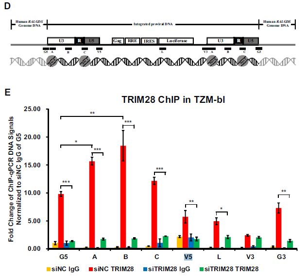 先前已鑒定TRIM28通過募集HDAC1以使HIV-1整合酶去乙?;瘉硪种艸IV-1整合。在TZM-bl和J-Lat 10.6細胞系中進行TRIM28的染色質免疫沉淀(ChIP)實驗,以研究其與整合的HIV-1 DNA的可能關聯(lián)。結果表明:TRIM28在HIV-1 LTR上顯著富集,不受TNFα信號傳導的影響。接下來,探究了TRIM28缺失是否會影響HIV-1 LTR的表觀遺傳狀態(tài),敲除TRIM28后H3K9me2和H3K9me3顯著減少,以及H3K4me3和H3K9Ac顯著增加,也誘導H3K27me3輕微下調,表明TRIM28通過控制抑制性表觀遺傳修飾來抑制HIV-1表達并導致HIV-1潛伏期。