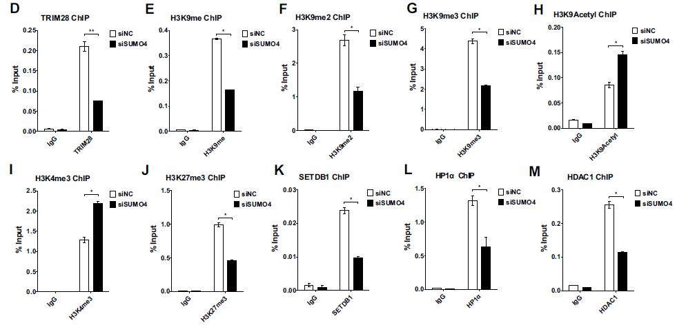 接下來探究了SUMO4是否可以影響TRIM28的功能和HIV-1啟動子的表觀遺傳狀態(tài):SUMO4敲低后,超過一半的TRIM28從HIV-1 LTR中丟失,表明TRIM28在HIV-1 LTR上的富集可能是部分SUMOylation依賴性的;SUMO4敲低后H3K9me、H3K9me2和H3K9me3在HIV-1 LTR上顯著降低,以及H3K9甲基化’writer’ SETDB1和’reader’ HP1α顯著降低;H3K9乙?;虷3K4me3的顯著上調和HDAC1的下調,這與先前報道TRIM28以SUMO化依賴性方式募集SETDB1、HP1α和HDAC1一致;H3K27me3在HIV-1 LTR上也降低。一些多梳抑制復合物2(PRC2)組分如EZH2和SUZ12(H3K27me3的主要’writer’)可能被SUMO4 SUMO化,導致修飾功能的增強。