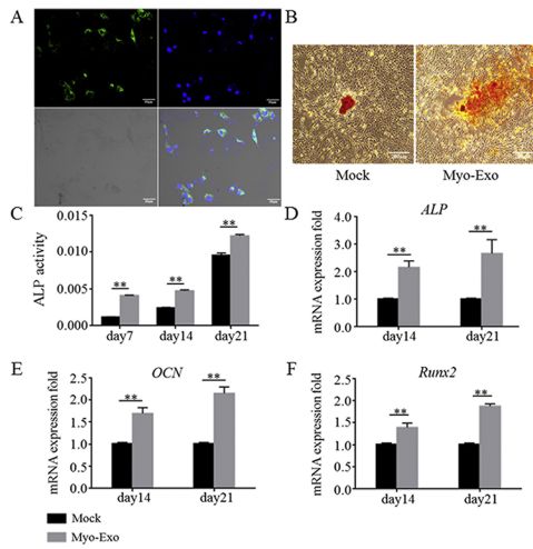 1、C2C12成肌細胞分泌的外泌體可以進入前成骨細胞MC3T3-E1,促進其成骨分化。