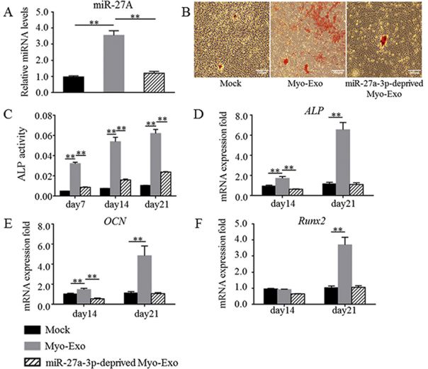 考慮到外泌體在細胞通訊中的作用,作者推測外泌體microRNAs是否也可以作為調(diào)節(jié)骨代謝的特殊“肌細胞因子”。在這項研究中,作者首次提供體外研究證據(jù),證明成肌細胞衍生的外泌體可以進入成骨細胞,促進成骨細胞分化。此外表明miR-27a-3p是這種效應的關鍵外泌體成分。
