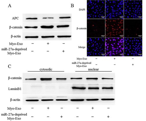 在成骨分化過程中,Wnt/β-catenin pathway起到重要作用,APC作為該通路的負調(diào)節(jié)蛋白已被證實直接受miR-27a-3p調(diào)控。MC3T3-E1攝入外泌體后,APC的表達受到明顯抑制,β-catenin的表達顯著升高且被激活。當miR-27a-3p敲低后,外泌體對APC-β-catenin pathway沒有影響。