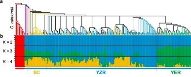 共計選擇了243份二倍體棉花材料:230份亞洲棉G. arboreum?(A2)?和13份草棉G. herbaceum?(A1),來自于中國南部(SC),長江(YZR)和黃河(YER)。以雷蒙德氏棉(G. raimondii)為外群,構(gòu)建系統(tǒng)發(fā)育樹顯示,G. herbaceum(草棉)和G. arboretum(亞洲棉)聚類成2個獨立的群(見圖2a和b)。G. arboretum(亞洲棉)進一步又分為SC,YZR和YER三個群,顯示了地理分布模式的差異,進而利用PCA分析支持這一結(jié)果(見圖2c)。