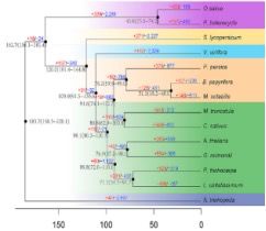 比較基因組分析:直系同源基因鑒定:?OrthoMCL (version 2.0);系統(tǒng)發(fā)育樹構(gòu)建與分化時間估算:?MUSCLE、Gblocks (version 0.91b)和RaxML(version 8),MCMCTREE評估分化時間;基因家族擴張和收縮分析:CAFE(vertion 3.1);染色體共線性分析、4DTV檢測及Ks值計算:MCscan。