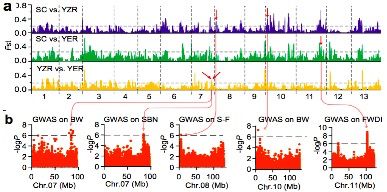 人工選擇在農(nóng)作物的馴化和遷徙的過程中具有重要的作用。群體結(jié)構(gòu)分析顯示當(dāng)K=4時,YER與SC和YZR明顯不同(圖2b,K=4)。通過兩兩群體間的選擇性清除分析(FST)鑒定出了分別覆蓋到59,53和51個顯著遺傳分化的區(qū)域。SC和YZR之間的21個分化的區(qū)域(約43.5 Mb?含有915個基因)在群體SC和YER之間是保守的(圖3a)。對來自不同環(huán)境下的11個重要性狀進行全基因組關(guān)聯(lián)分析,在98個顯著關(guān)聯(lián)的信號中,其中25信號個來自基因區(qū)(外顯子或內(nèi)含子區(qū)),包含與形態(tài)性狀相關(guān)的8個信號區(qū),與產(chǎn)量性狀相關(guān)的6個信號區(qū),與油籽性狀相關(guān)的3個信號區(qū);剩余73個信號來自非編碼區(qū)。大部分農(nóng)藝性狀的GWAS關(guān)聯(lián)信號中顯示地理差異,如分支數(shù),開花期,鈴重和抗病性這些性狀定位在保守的基因區(qū)(圖4b)。