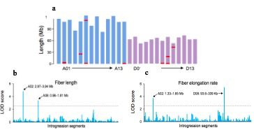 由陸地棉Emian22作為受體親本,海島棉3-79作為供體親本構(gòu)建包含168個個體的CSSLs群體,旨在引入有利的變異,如纖維質(zhì)量。QTL定位分析,共鑒定到5個性狀的13個QTLs位點,其中控制纖維長度位點2個,控制纖維強度位點4個,馬克隆值位點2個,纖維伸長率位點2個,纖維均勻度位點3個(圖3)。在這些QTLs位點中,9個位點之前未被鑒定出,通過檢驗13個QTLs中的基因表達水平,研究人員檢測到了235個在纖維發(fā)育過程中高度表達的基因,同時還整合了基因組變異數(shù)據(jù)來預(yù)測候選基因,而這些基因值得進一步進行精細定位以確認對這些性狀具有重要影響的基因。