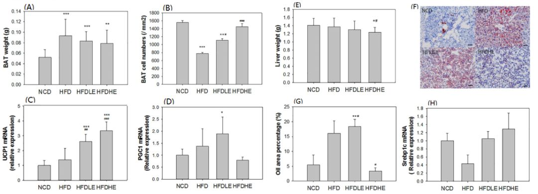 NLE未能顯著降低HFD導(dǎo)致的BAT增長(圖2A),與脂肪代謝有關(guān)的UCP1和PGC1基因表達在HFD-LE組中顯著升高(圖2C-2D),HFD-HE顯著降低了肝重(圖2E),NLE對HFD誘導(dǎo)的脂肪增生具有有效的抑制作用(圖2F-2G)。Srebp1c與肝脂肪的變性有關(guān),NLE對HFD導(dǎo)致的Srebp1c基因表達水平降低有恢復(fù)作用(圖2H)。